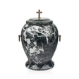 Ритуальна урна виготовлена з натурального мармуру та призначена для зберігання праху після кремації. Має унікальний чорно-білий малюнок каменю, що надає виробу вишуканого та гідного вигляду. Декорована металевим хрестом та бічними ручками для зручності.